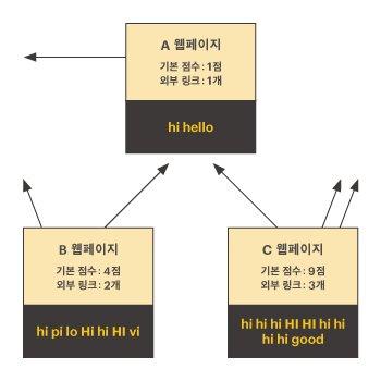 - 그러므로, A 웹페이지의 매칭점수는 기본점수 1점 + 링크점수 5점 = 6점이 된다.